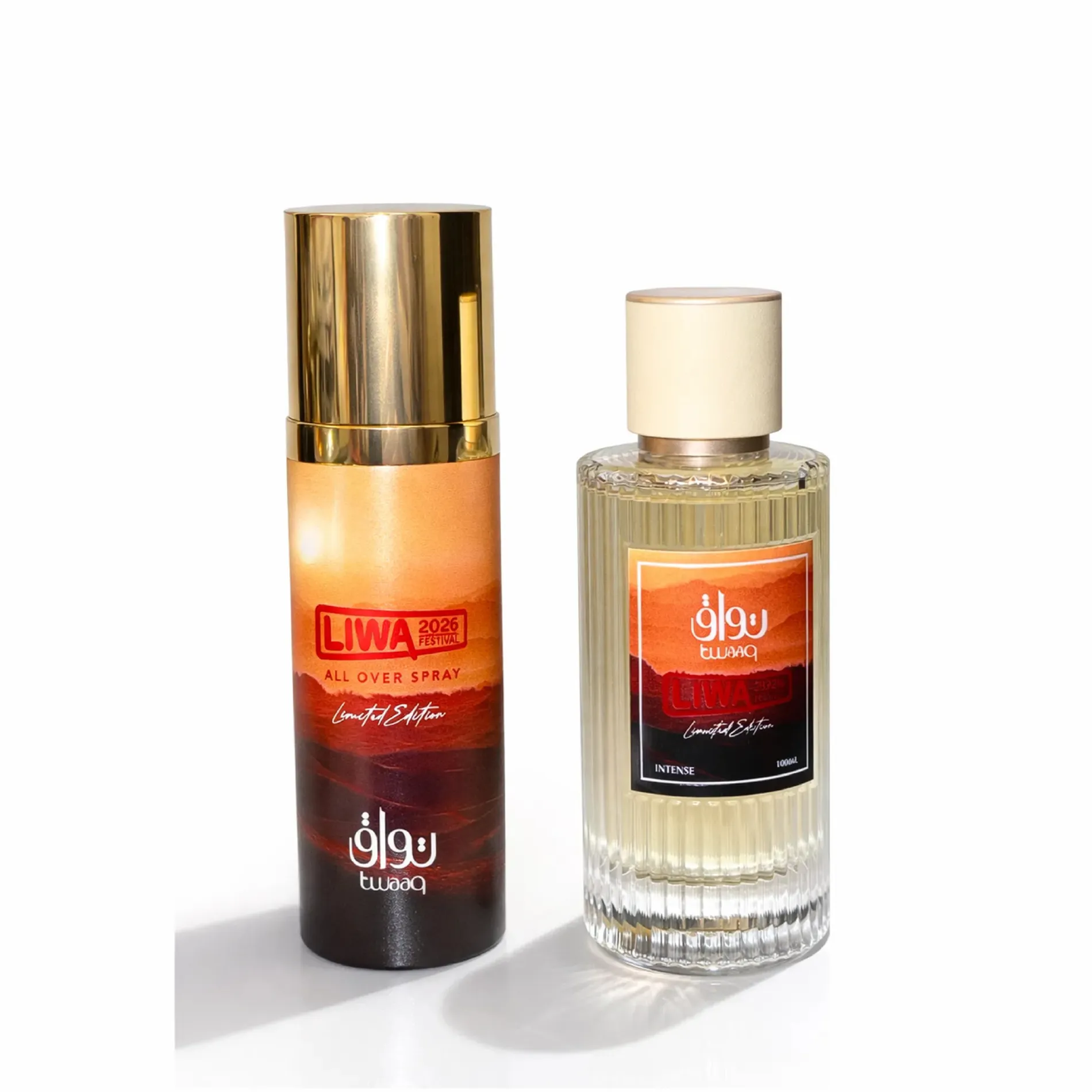 A festival-exclusive limited edition set inspired by the Liwa International Festival 2026, featuring a 100ml Liwa 2026 intense and a 100ml Liwa 2026 All Over Spray — a bold desert fragrance shaped by adventure, off-roading, and the spirit of the dunes.