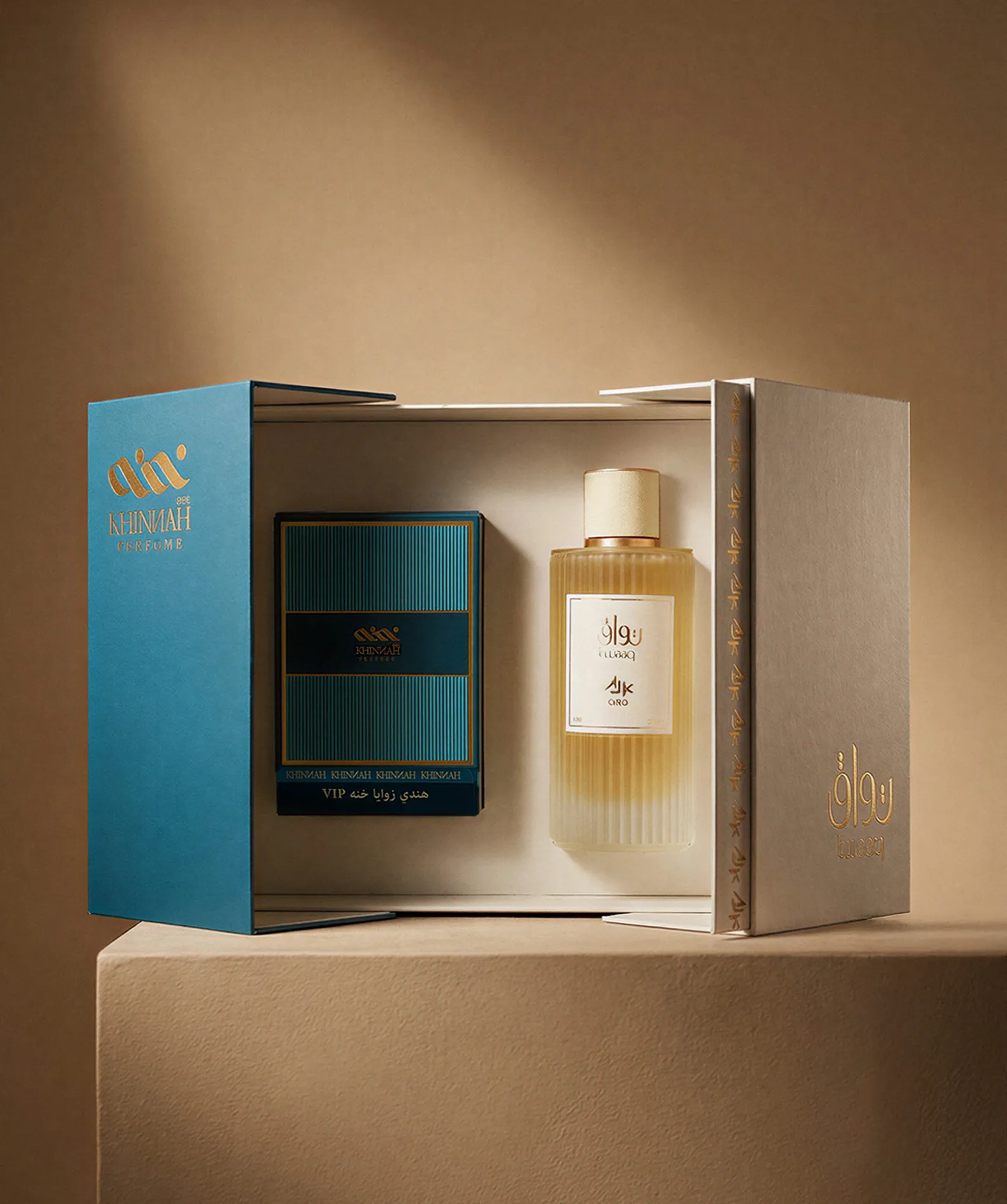 Co-branded packaging in blue Khinnah and off-white Twaaq, adorned with gold lettering.