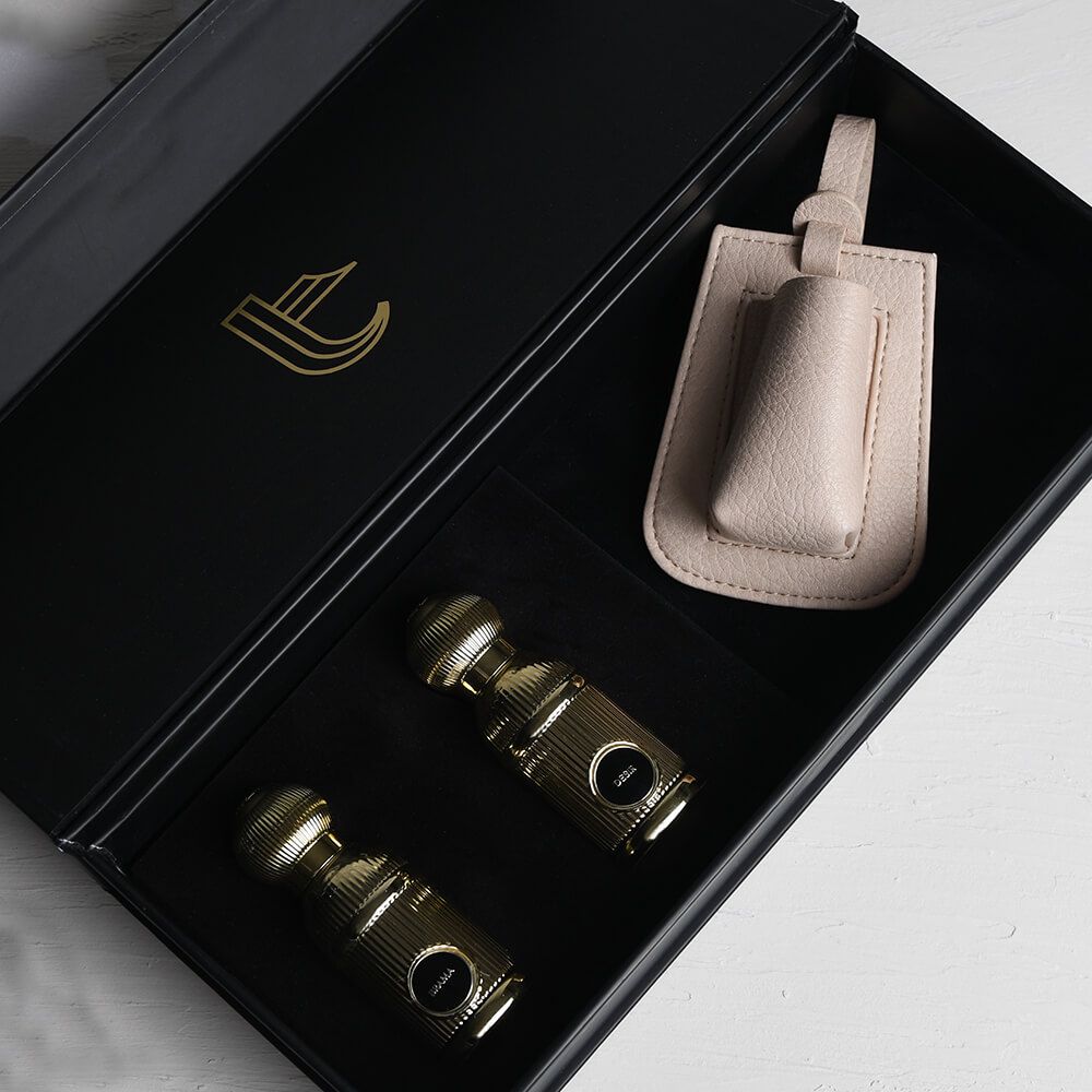 حقيبة صغيره مصنوعه من الجلد القيم بألوان متعددة لتناسب جميع الأذواق تقدم مع عطرين